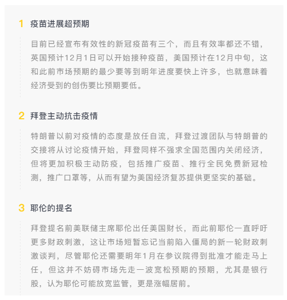 说起来有点讽刺,昨晚美股有点像“涨声”欢送特朗普。我们在昨天的文章《特朗普终于认输!拜登治下美国会更好吗?》中提到,特朗普终于肯承认自己败选了,并且开始启动和拜登团队进行权利过渡,这也就意味着美国大选正式尘埃落定了。换句话说,这意味着不确定性消除,作为风险资产的美股心头的大石自然也就放下了。
