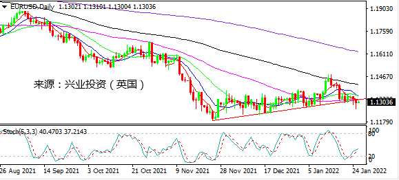 日图向下刺穿11月低点以来的温和上升趋势线,随机指标倾向走高,关注能否重新站上该线。4小时图再在1.1300下方收录早晨指向,短线反弹关注1.1320阻力。小时图先抑后扬,再创新低,关注能否企稳1.1300。日内建议谨慎操作,关注1.1300一线表现决定进一步方向。