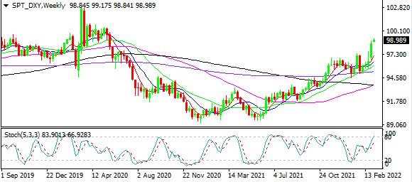 上周美元指数整体在97.70附近偏强震荡,因美联储主席鲍威尔尽管未关闭未来一次加息50个基点的可能性,但明确3月仅加息25个基点,但上周五消息称乌克兰最大的核电站被袭击,再度引起市场对俄乌紧张局势的担忧,美元指数快速拉升向上突破当周高点,并在强劲的非农报告推波助澜下上探98.87。本周开盘,美指再次因为美国研究制裁俄罗斯原油进口引起的紧张气氛而跳空高开,站上99.00上方。分析师团队认为, 尽管俄乌局势持续紧张,仍将继续为美元指数提供动能,但这种动能是不可持续的,而作为美元指数篮子货币中权重最大的欧元因俄乌战局不确定性表现羸弱,或继续推涨美元指数。