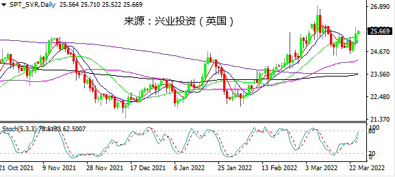 日图向上突破25.50,打开进一步上行空间,随机指标也倾向走高。4小时图震荡走高,上行动能维持完好。小时图连续大幅拉升后短线回调,在25.50一线企稳走高,关注能否再创新高。日内建议25.50上方做多,紧设止损,先看25.80。