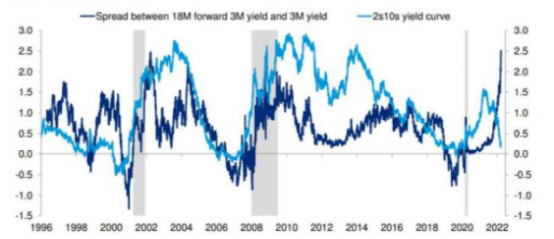 为什么倒挂预期衰退呢?收益率曲线倒挂可能是短端远期利率上行,或者是长端远期利率下行的结果。而长端远期利率的下行,又可能是市场对未来经济悲观预期、以及期限溢价压降的结果。
