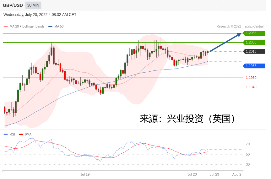 交易策略:在 1.1985 之上,看涨,目标价位为 1.2035 ,然后为 1.2055 。
