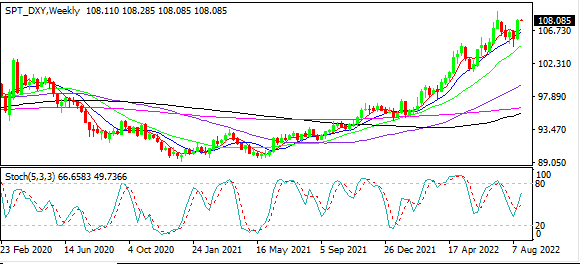 技术上看,美元指数周图以大阳线拉升测试前期关键阻力108.10上方水平,但随机指标受下降趋势线打压,出现熊背离,对进一步上行保持谨慎。上方阻力关注109.30,为长期关键阻力水平,若有效向上突破,则有望延续去年5月以来的上行趋势。反之,若破败该档,有望酝酿双顶,颈线位于105.50/00。日图回踩在MA50一线企稳连续上行,随机指标进入超买区域且逼近前期高点,不排除修正的可能性。综述,本周美元指数前半段可能在108一线拉锯,后半段或仍难有效向上突破7月高点,警惕冲高回落风险。