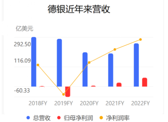 不停地吃官司,使得德银的利润被疯狂吞噬。这些年,德银大多数都是巨亏, 只有短暂的一两年里面赚到了一点微薄的利润。不过,自2019年重组以来,德银的收入、利润都出现了大幅增长。2022年,德银实现了50亿欧元的净利润,较2021年增长了159%。