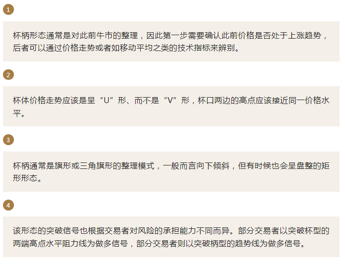 其中杯体是在一段上涨后形成的,看起来像个圆形底或U形,当杯体部分完成后,价格往往会出现一段调整行情,略微向下倾斜,这就形成了杯把。