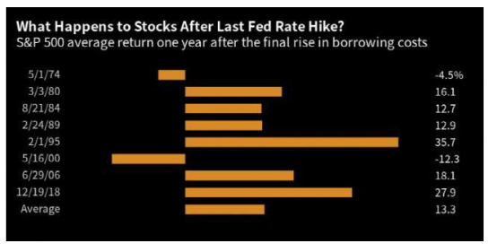 这是市场定价目前预测的结果,也就是市场期待的“最后一次加息”。从历史数据来看,这对股市显然是相对有利的。在之前的八个货币紧缩周期中,标普500指数在最后一次加息后一年内平均上涨了13%。