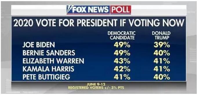 然而,计划赶不上变化。来自福克斯的最新民调显示,有5位民主党参选人的支持率已遥遥领先,其中前副总统拜登在全国注册选民中获得49%的选民支持,领先特朗普10%。另一总统参选人、参议员桑德斯也获得49%的支持率,其余3位民主党人士——参议员沃伦、参议员哈里斯以及印第安纳州南本德市市长布塔朱吉,以1至2个百分点的优势略胜于特朗普。