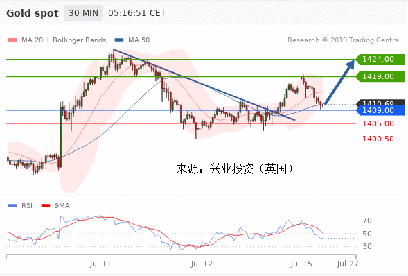 交易策略:在1409.00之上,看涨,目标价位为 1419.00,然后为1424.00。