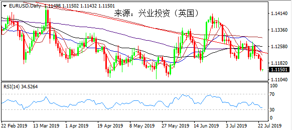 由于美国国会达成债务上限协议,避险政府关门风险。加上美联储降息50个基点的预期进一步排除,美元指数连续第三日大幅走高,最高刷新一个多月高位97.70,收在97.68。美元飙升令欧元受挫。据调查显示,欧央行已有高达40%的概率在本周四的会议上立刻宣布降息10个基点。欧央行持续宽松的预期同样不利于欧元。周二欧元/美元加速下滑逾60点,最低触及1.1145,创近两个月低位,收在1.1150,跌幅为0.5%。市场普遍预计,即使欧央行本月不采取行动,也有望释放强力宽松预期,在本周四前持续推低欧元。日内可关注欧元区各国Markit制造业PMI等数据,若数据疲弱,预计欧元将继承刷新低位。
