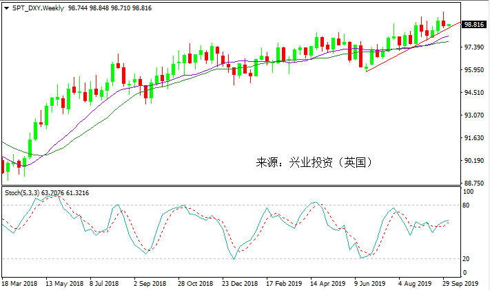 技术面,上周美元指数继续维持在上升趋势,均线以及慢步随机指标都趋向中性,暗示美元仍将维持上涨但震荡的行情。只要不跌破97.75(MA20的所在位),我们仍偏向看涨,且依旧执行逢低买入的策略。